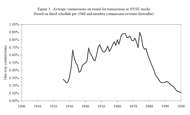 1. Falling fees: Prior to 1975, the NYSE required that all members set minimum commission rates. Competitive pressures from over-the-counter exchanges (along with SEC pressure) finally convinced the NYSE board to deregulate commissions in 1975, the famous Mayday episode. In Canada, the changeover date was 1983. As the chart below shows, commissions plunged.